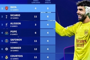 24直播网4月30日讯 阿森纳在本轮欧冠客场1-1战平马竞,拉亚未能继续零封,但他本赛季依然领跑欧冠零封榜。